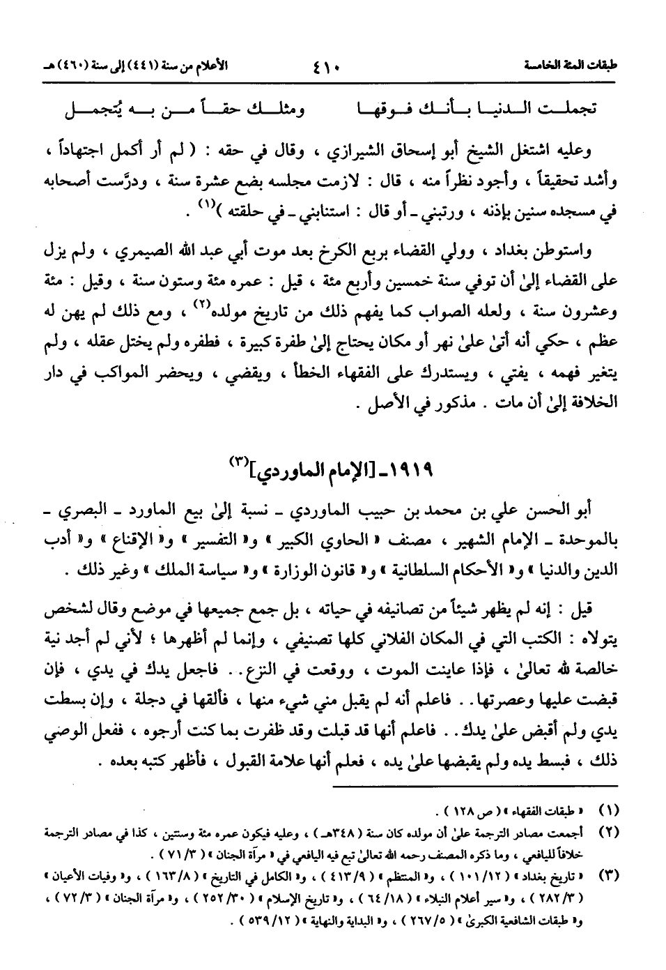 (3) «تاريخ بغداد» (12/ 101)، و «المنتظم» (9/ 413)، و «الكامل في التاريخ» (8/ 163)، و «وفيات الأعيان» (3/ 282)، و «سير أعلام النبلاء» (18/ 64)، و «تاريخ الإسلام» (30/ 252)، و «مرآة الجنان» (3/ 72)، و «طبقات الشافعية الكبرى» (5/ 267)، و «البداية والنهاية» (12/ 539).