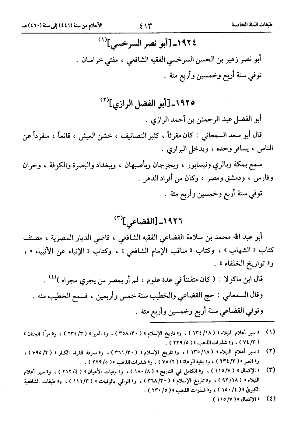 (3) «الإكمال» (7/ 115)، و «الكامل في التاريخ» (8/ 180)، و «وفيات الأعيان» (4/ 212)، و «سير أعلام النبلاء» (18/ 92)، و «تاريخ الإسلام» (30/ 368)، و «الوافي بالوفيات» (3/ 116)، و «طبقات الشافعية الكبرى» (4/ 150)، و «شذرات الذهب» (5/ 230).