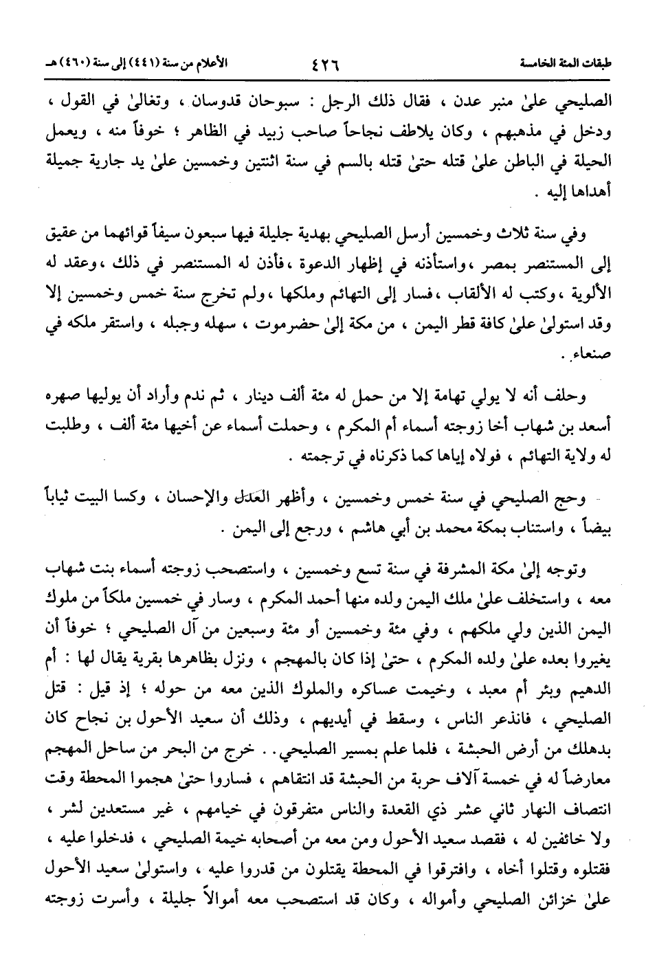 الصليحي على منبر عدن، فقال ذلك الرجل: سبوحان قدوسان، وتغالى في القول، ودخل في مذهبهم، وكان يلاطف نجاحا صاحب زبيد في الظاهر؛ خوفا منه، ويعمل الحيلة في الباطن على قتله حتى قتله بالسم في سنة اثنتين وخمسين على يد جارية جميلة أهداها إليه.