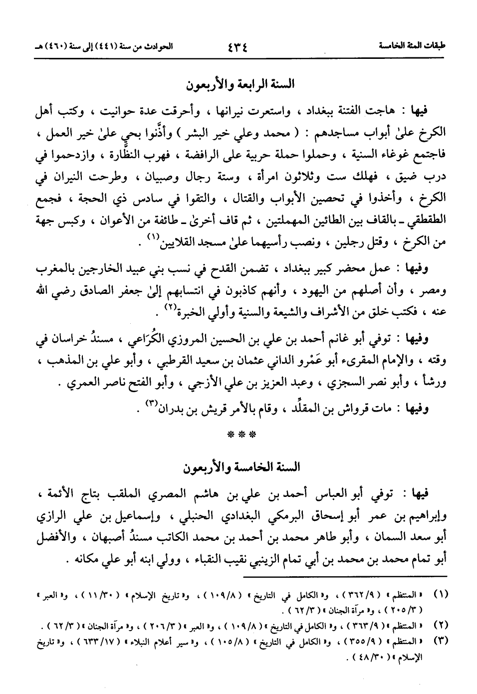 (2) «المنتظم» (9/ 363)، و «الكامل في التاريخ» (8/ 109)، و «العبر» (3/ 206)، و «مرآة الجنان» (3/ 62).