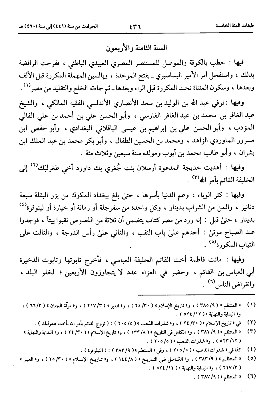 (5) «المنتظم» (9/ 383)، و «الكامل في التاريخ» (8/ 144)، و «تاريخ الإسلام» (30/ 25)، و «العبر» (3/ 217)، و «البداية والنهاية» (12/ 524).