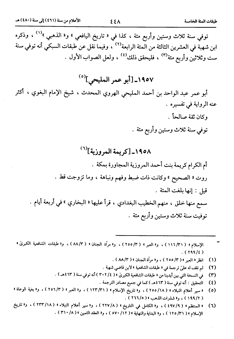 (6) «المنتظم» (9/ 497)، و «الكامل في التاريخ» (8/ 227)، و «سير أعلام النبلاء» (18/ 233)، و «تاريخ الإسلام» (31/ 125)، و «البداية والنهاية» (12/ 570)، و «العقد الثمين» (8/ 310).