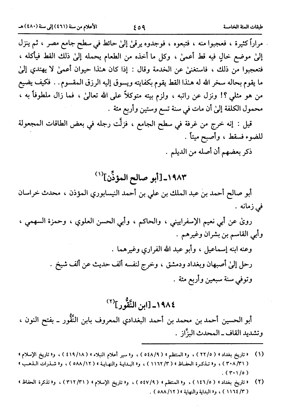(2) «تاريخ بغداد» (5/ 146)، و «المنتظم» (9/ 547)، و «تاريخ الإسلام» (31/ 312)، و «تذكرة الحفاظ» (3/ 1164)، و «البداية والنهاية» (12/ 588).