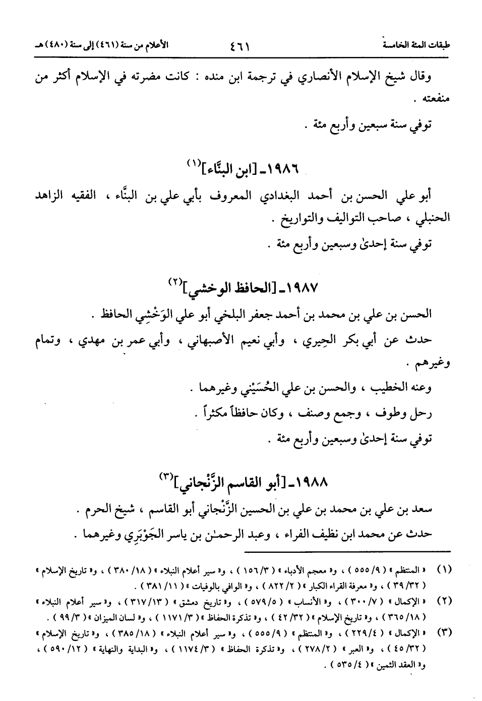 (1) «المنتظم» (9/ 555)، و «معجم الأدباء» (3/ 156)، و «سير أعلام النبلاء» (18/ 380)، و «تاريخ الإسلام» (32/ 39)، و «معرفة القراء الكبار» (2/ 822)، و «الوافي بالوفيات» (11/ 381).