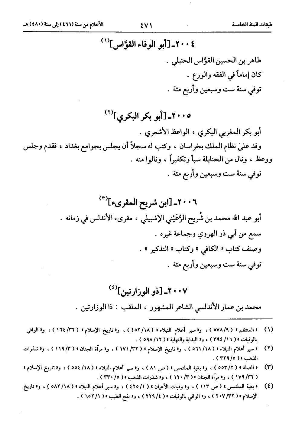 (4) «بغية الملتمس» (ص 113)، و «وفيات الأعيان» (4/ 425)، و «سير أعلام النبلاء» (18/ 582)، و «تاريخ الإسلام» (32/ 207)، و «الوافي بالوفيات» (4/ 229)، و «نفح الطيب» (1/ 652).