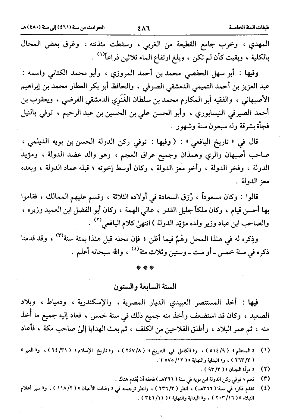 (4) تقدم ذكره في سنة (366 هـ)، انظر (3/ 236)، وانظر ترجمته في «وفيات الأعيان» (2/ 118)، و «سير أعلام النبلاء» (16/ 203)، و «البداية والنهاية» (11/ 346).