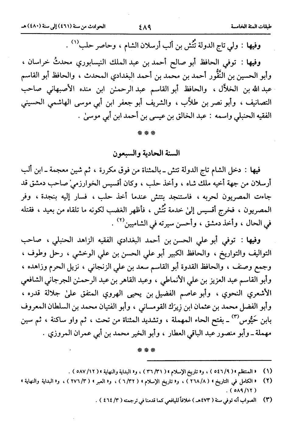 (2) «الكامل في التاريخ» (8/ 268)، و «تاريخ الإسلام» (32/ 6)، و «العبر» (3/ 276)، و «البداية والنهاية» (12/ 589).