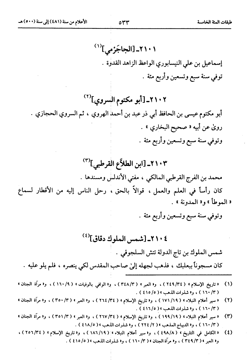 (1) «تاريخ الإسلام» (34/ 249)، و «العبر» (3/ 348)، و «الوافي بالوفيات» (9/ 160)، و «مرآة الجنان» (3/ 160)، و «شذرات الذهب» (5/ 415).
