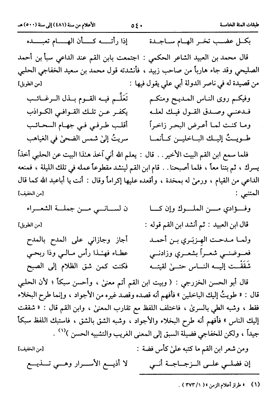 قال محمد بن العبيد الشاعر الحكمي: اجتمعت بابن القم عند الداعي سبأ بن أحمد الصليحي وقد جاء هاربا من صاحب زبيد، فأنشدته قول محمد بن سعيد الخفاجي الحلبي من قصيدة له في ناصر الدولة أبي علي يقول فيها: [من الطويل]