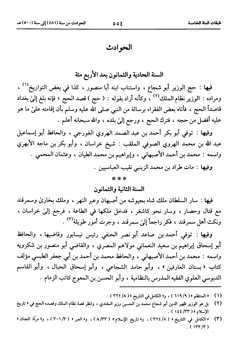 فيها: حج الوزير أبو شجاع، واستناب ابنه أبا منصور، كذا في بعض التواريخ (1)، ومراده: الوزير نظام الملك (2)، وكأنه أراد بقوله: (حج) قصد الحج؛ فإنه بلغ إلى بغداد قاصدا الحج، فأتاه بعض الفقراء برسالة من النبي صلّى الله عليه وسلم بأن إقامته على ما هو عليه أفضل من حجه، فترك الحج، ورجع إلى بلده، والله سبحانه أعلم.