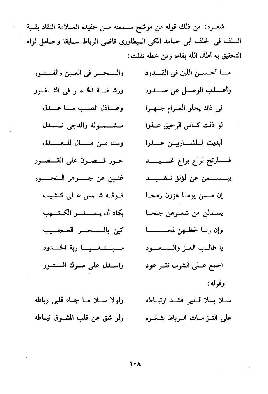 شعره: من ذلك قوله من موشح سمعته من حفيده العلامة النقاد بقية