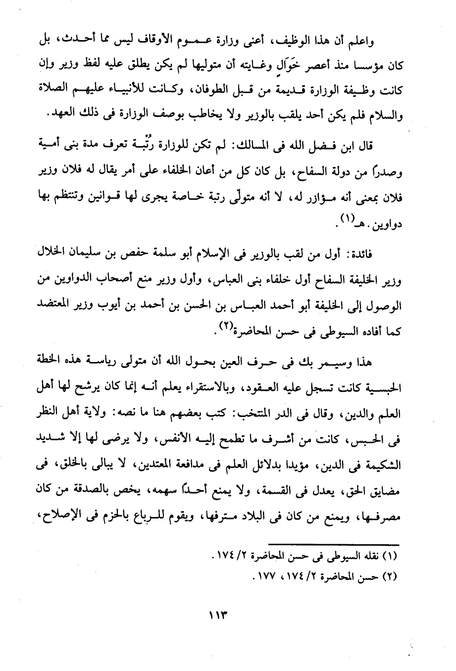 واعلم أن هذا الوظيف، أعنى وزارة عموم الأوقاف ليس مما أحدث، بل كان مؤسسا منذ أعصر خَوَالٍ وغايته أن متوليها لم يكن يطلق عليه لفظ وزير وإن كانت وظيفة الوزارة قديمة من قبل الطوفان، وكانت للأنبياء عليهم الصلاة والسلام فلم يكن أحد يلقب بالوزير ولا يخاطب بوصف الوزارة في ذلك العهد.