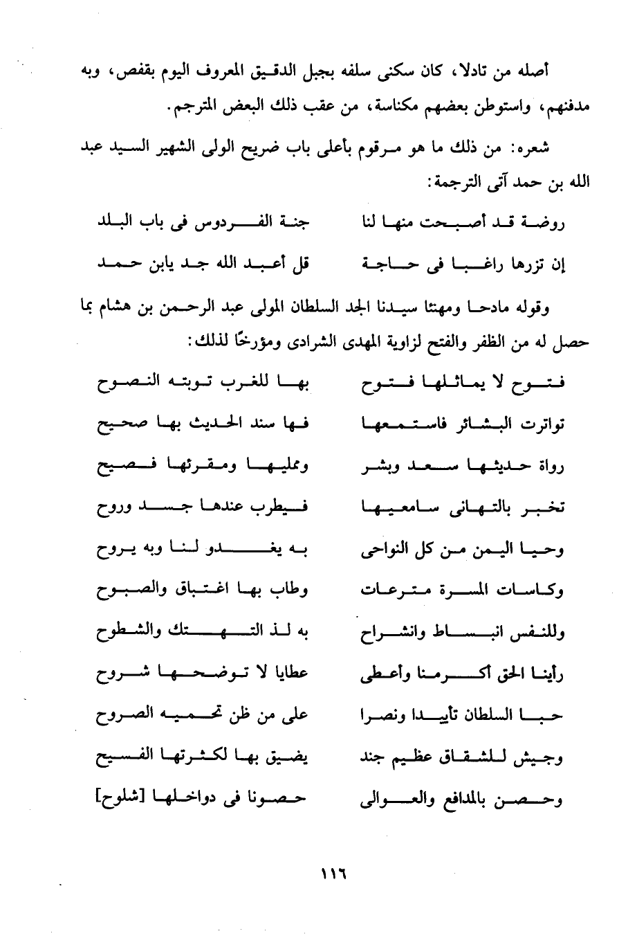 وقوله مادحا ومهنئا سيدنا الجد السلطان المولى عبد الرحمن بن هشام بما حصل له من الظفر والفتح لزاوية المهدى الشرادى ومؤرخًا لذلك: