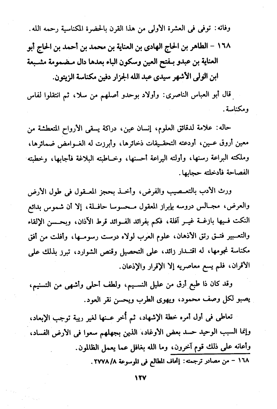 168 - الطاهر بن الحاج الهادي بن العناية بن محمد بن أحمد بن الحاج أبو العناية بن عبدو بفتح العين وسكون الباء بعدها دال مضمومة مشبعة ابن الولى الأشهر سيدى عبد الله الجزار دفين مكناسة الزيتون.