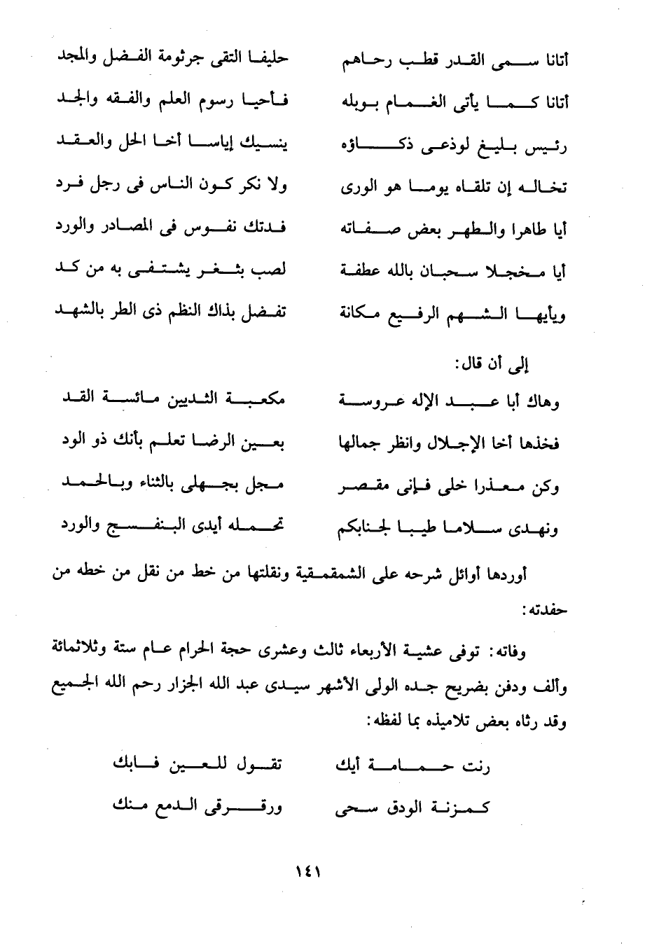 وفاته: توفى عشية الأربعاء ثالث وعشرى حجة الحرام عام ستة وثلاثمائة وألف ودفن بضريح جده الولى الأشهر سيدى عبد الله الجزار رحم الله الجميع وقد رثاه بعض تلاميذه بما لفظه: