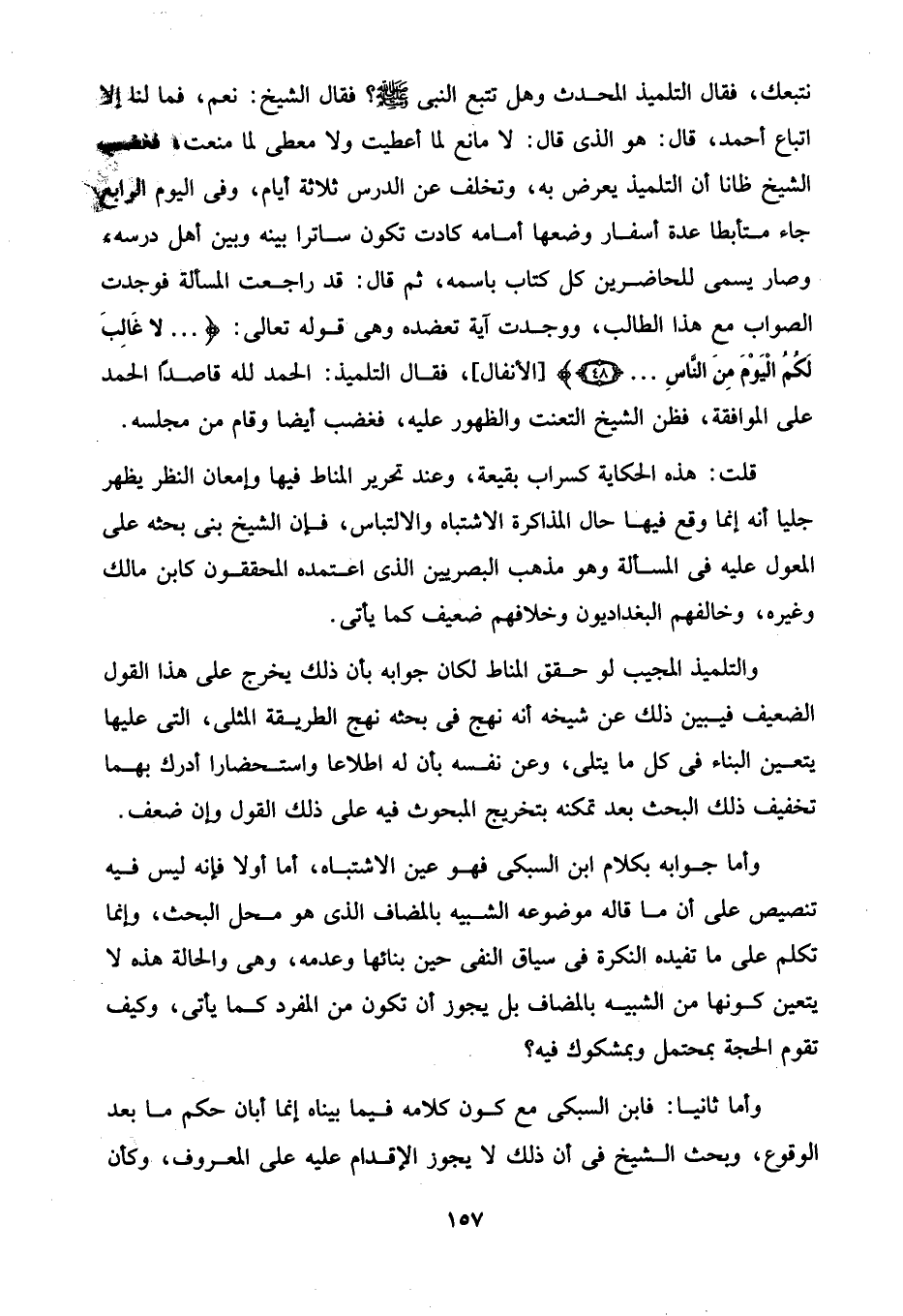 نتبعك، فقال التلميذ المحدث وهل تتبع النبي - صلى الله عليه وسلم -؟ فقال الشيح: نعم، فما لنا إلا اتباع أحمد، قال: هو الذى قال: لا مانع لما أعطيت ولا معطى لما منعت، فغضب الشيخ ظانا أن التلميذ يعرض به، وتخلف عن الدرس ثلاثة أيام، وفى اليوم الرابع جاء متأبطا عدة أسفار وضعها أمامه كادت تكون ساترا بينه وبين أهل درسه، وصار يسمى للحاضرين كل كتاب باسمه، ثم قال: قد راجعت المسألة فوجدت الصواب مع هذا الطالب، ووجدت آية تعضده وهى قوله تعالى: {... لَا غَالِبَ لَكُمُ الْيَوْمَ مِنَ النَّاسِ ...} [الأنفال]، فقال التلميذ: الحمد لله قاصدًا الحمد على الموافقة، فظن الشيخ التعنت والظهور عليه، فغضب أيضًا وقام من مجلسه.