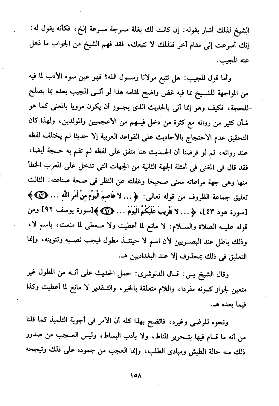 وأما قول المجيب: هل تتبع مولانا رسول الله؟ فهو عين سوء الأدب لما فيه من المواجهة للشيخ بما فيه غض واضح لمقامه هذا لو أتى المجيب بعده بما يصلح للحجة، فكيف وهو إنما أتى بالحديث الذى يجوز أن يكون مرويا بالمعنى كما هو شأن كثير من رواته مع كثرة من دخل فيهم من الأعجميين والمولدين، ولهذا كان التحقيق عدم الاحتجاج بالأحاديث على القواعد العربية إلا حديثا لم يختلف لفظه عند رواته، ثم لو فرضنا أن الحديث هنا متفق على لفظه لم تقم به حجة أيضًا، فقد قال في المغنى في أمثلة الجهة الثانية من الجهات التي تدخل على المعرب الخطأ منها وهى جهة مراعاته معنى صحيحا وغفلته عن النظر في صحة صناعته: الثالث تعليق جماعة الظروف من قوله تعالى: {... لَا عَاصِمَ الْيَوْمَ مِنْ أَمْرِ اللَّهِ ... (43)} [سورة هود 43]، {... لَا تَثْرِيبَ عَلَيْكُمُ الْيَوْمَ ... (92)} [سورة يوسف 92] ومن قوله عليه الصلاة والسلام: لا مانع لما أعطيت ولا معطى لما منعت، باسم لا، وذلك باطل عند البصريين لأن اسم لا حينئذ مطول فيجب نصبه وتنوينه، وإنما التعليق في ذلك بمحذوف إلا عند البغداديين هـ.