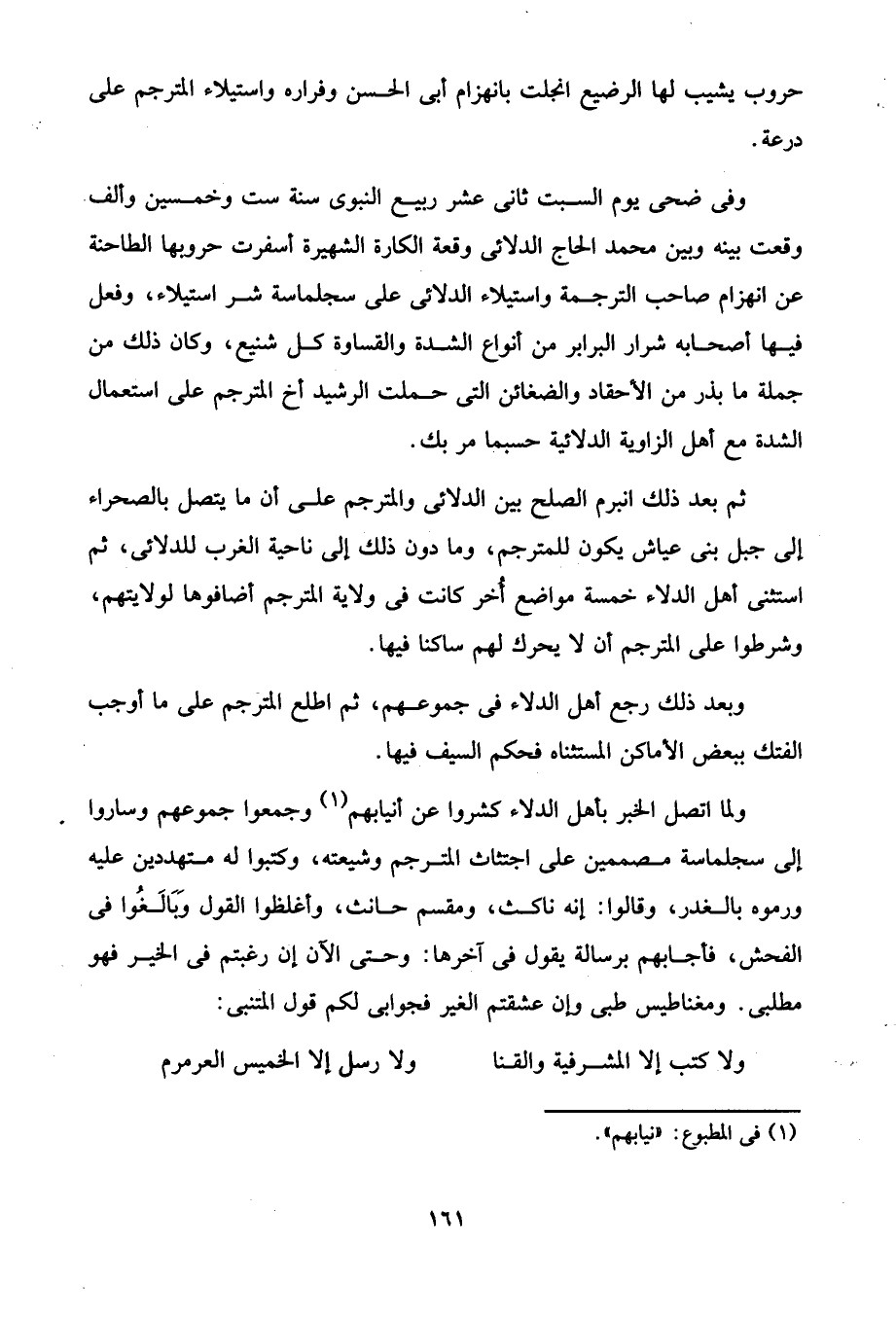 وبعد ذلك رجع أهل الدلاء في جموعهم، ثم اطلع المترجم على ما أوجب الفتك ببعض الأماكن المستثناه فحكم السيف فيها.