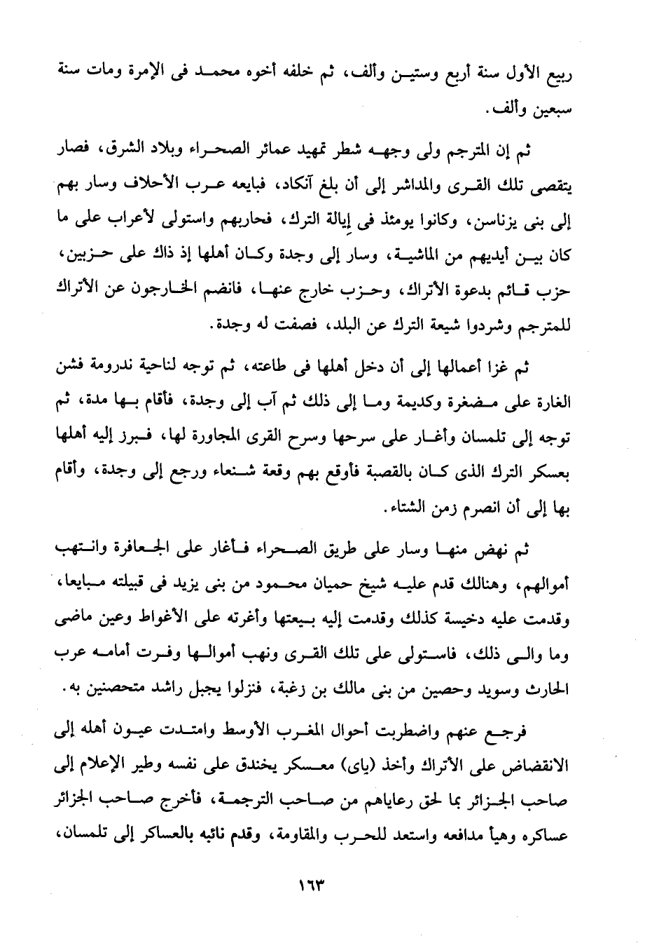 ثم غزا أعمالها إلى أن دخل أهلها في طاعته، ثم توجه لناحية ندرومة فشن الغارة على مضغرة وكديمة وما إلى ذلك ثم آب إلى وجدة، فأقام بها مدة، ثم توجه إلى تلمسان وأغار على سرحها وسرح القرى المجاورة لها، فبرز إليه أهلها بعسكر الترك الذى كان بالقصبة فأوقع بهم وقعة شنعاء ورجع إلى وجدة، وأقام بها إلى أن انصرم زمن الشتاء.