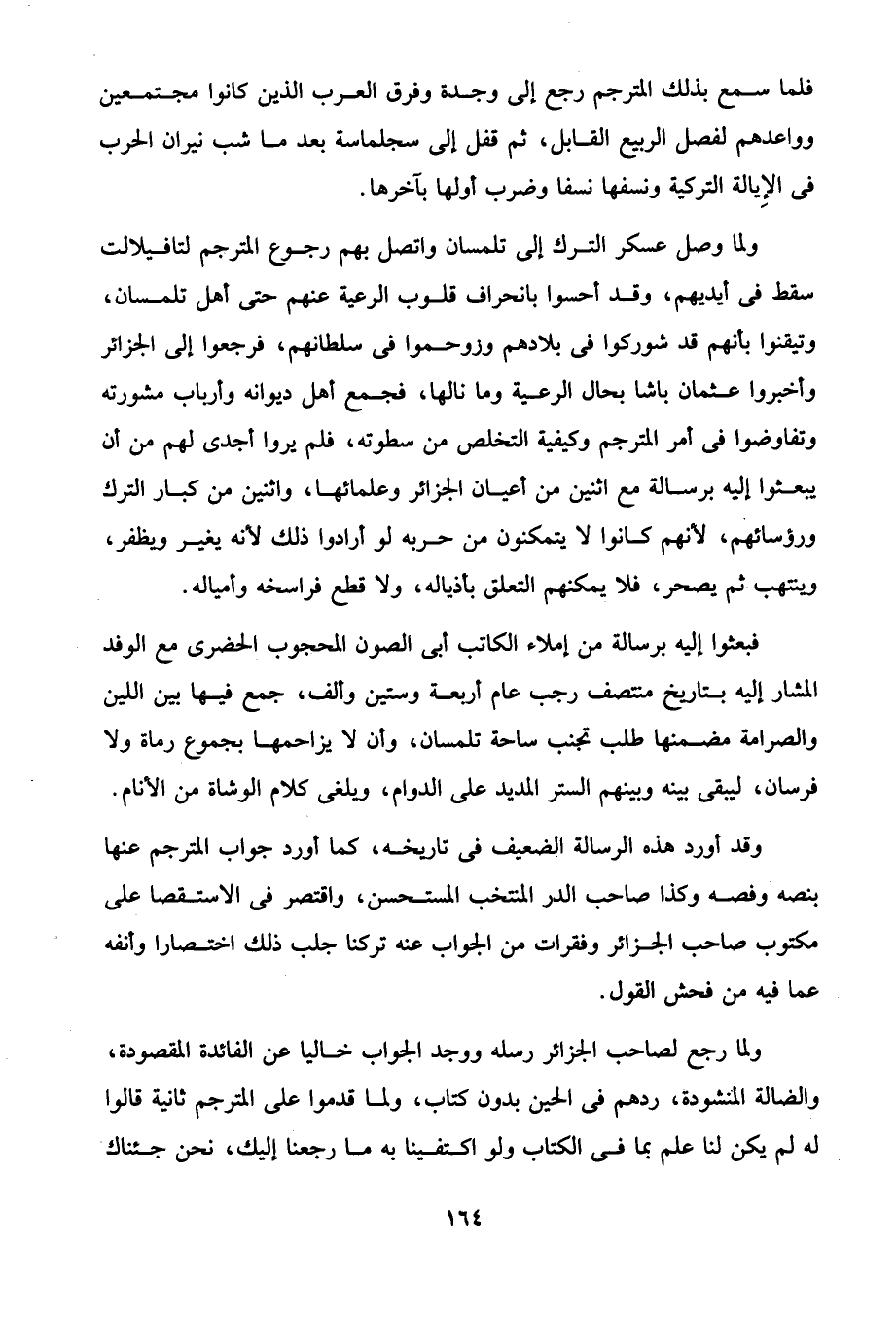 ولما رجع لصاحب الجزائر رسله ووجد الجواب خاليا عن الفائدة المقصودة، والضالة المنشودة، ردهم في الحين بدون كتاب، ولما قدموا على المترجم ثانية قالوا له لم يكن لنا علم بما في الكتاب ولو اكتفينا به ما رجعنا إليك، نحن جئناك