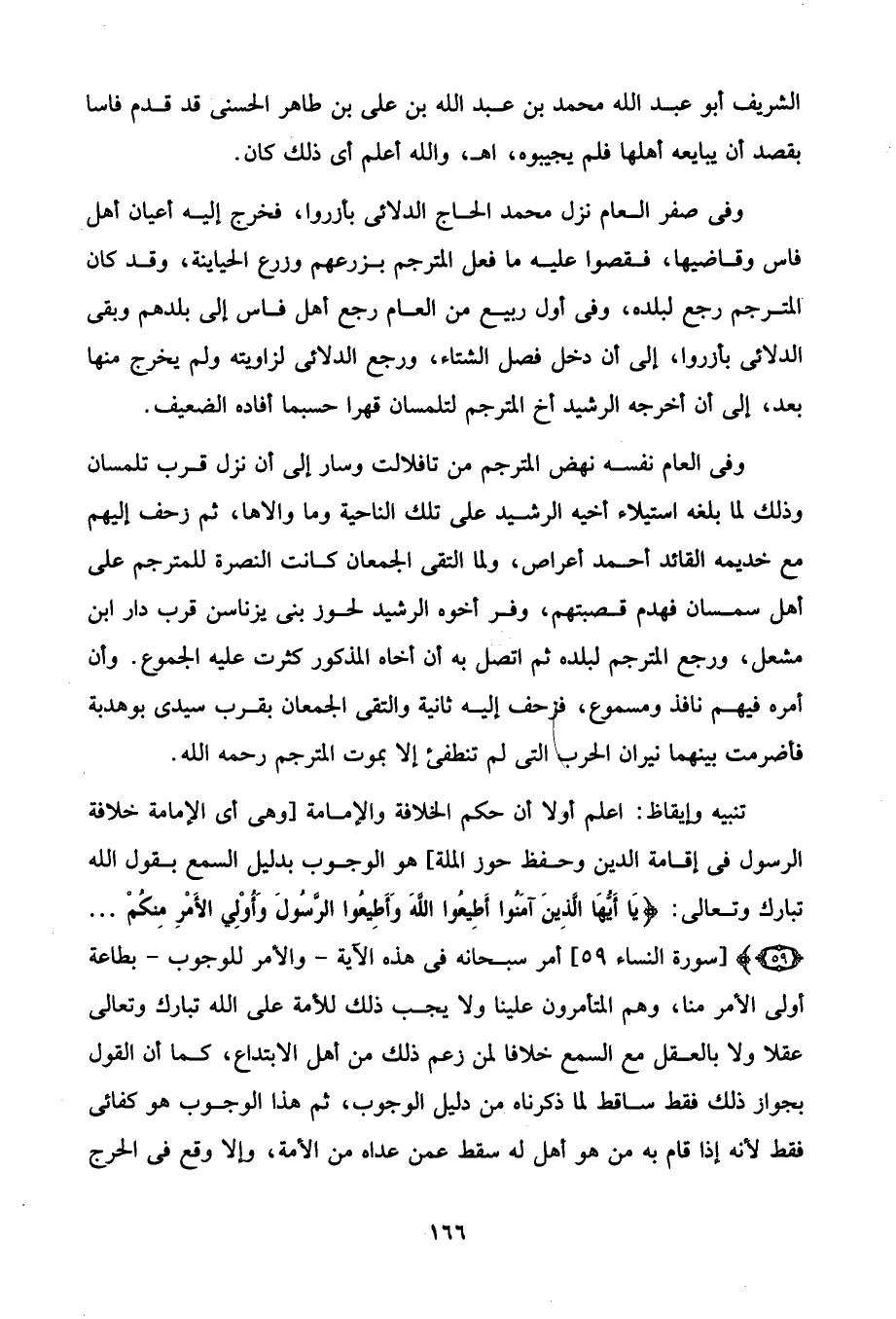 تنبيه وإيقاظ: اعلم أولا أن حكم الخلافة والإمامة [وهى أى الإمامة خلافة الرسول في إقامة الدين وحفظ حوز الملة] هو الوجوب بدليل السمع بقول الله تبارك وتعالى: {يَاأَيُّهَا الَّذِينَ آمَنُوا أَطِيعُوا اللَّهَ وَأَطِيعُوا الرَّسُولَ وَأُولِي الْأَمْرِ مِنْكُمْ ... (59)} [سورة النساء 59] أمر سبحانه في هذه الآية -والأمر للوجوب- بطاعة أولى الأمر منا، وهم المتأمرون علينا ولا يجب ذلك للأمة على الله تبارك وتعالى عقلا ولا بالعقل مع السمع خلافا لمن زعم ذلك من أهل الابتداع، كما أن القول بجواز ذلك فقط ساقط لما ذكرناه من دليل الوجوب، ثم هذا الوجوب هو كفائى فقط لأنه إذا قام به من هو أهل له سقط عمن عداه من الأمة، وإلا وقع في الحرج
