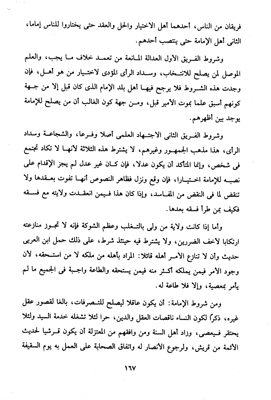 وشروط الفريق الثانى الاجتهاد العلمى أصلا وفرعا، والشجاعة وسداد الرأى، هذا مذهب الجمهور وغيرهم، لا يشترط هذه الثلاثة لأنها لا تكاد تجتمع في شخص، وإنما المتأكد أن يكون عدلا، فإن كان غير عدل لم يجز الإقدام على نصبه للإمامة اختيارا، فإن وقع ونزل فظاهر النصوص أنها تفوت بعقدها ولا تنقض لما في النقض من المفاسد، وإذا كان هذا فيمن انعقدت ولايته مع فسقه فكيف بمن طرأ فسقه بعدها.