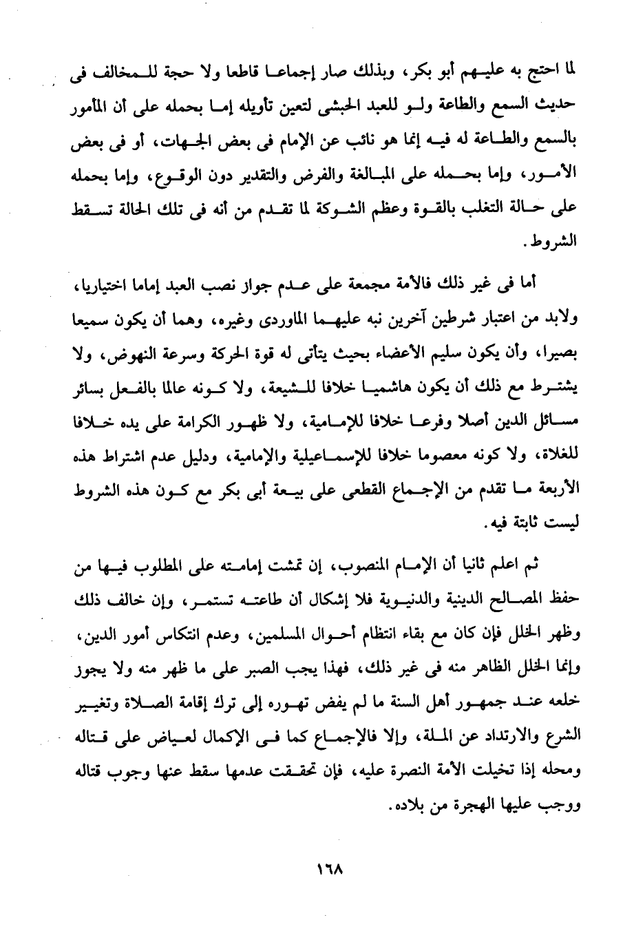 أما في غير ذلك فالأمة مجمعة على عدم جواز نصب العبد إماما اختياريا، ولابد من اعتبار شرطين آخرين نبه عليهما الماوردى وغيره، وهما أن يكون سميعا بصيرا، وأن يكون سليم الأعضاء بحيث يتأتى له قوة الحركة وسرعة النهوض، ولا يشترط مع ذلك أن يكون هاشميا خلافا للشيعة، ولا كونه عالما بالفعل بسائر مسائل الدين أصلا وفرعا خلافا للإمامية، ولا ظهور الكرامة على يده خلافا للغلاة، ولا كونه معصوما خلافا للإسماعيلية والإمامية، ودليل عدم اشتراط هذه الأربعة ما تقدم من الإجماع القطعى على بيعة أبى بكر مع كون هذه الشروط ليست ثابتة فيه.