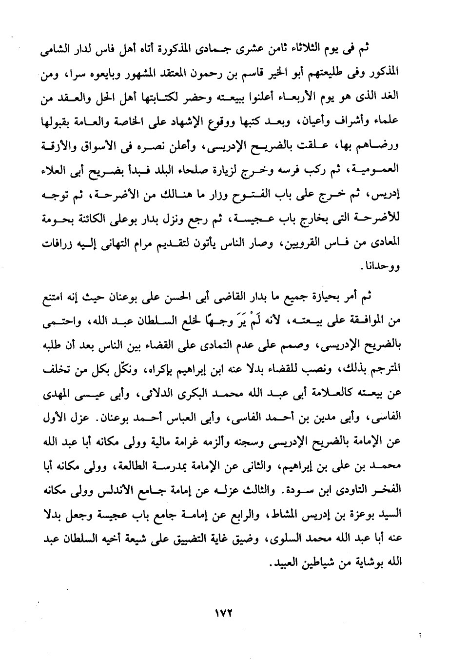 ثم في يوم الثلاثاء ثامن عشرى جمادى المذكورة أتاه أهل فاس لدار الشامى المذكور وفى طليعتهم أبو الخير قاسم بن رحمون المعتقد المشهور وبايعوه سرا، ومن الغد الذى هو يوم الأربعاء أعلنوا ببيعته وحضر لكتابتها أهل الحل والعقد من علماء وأشراف وأعيان، وبعد كتبها ووقوع الإشهاد على الخاصة والعامة بقبولها ورضاهم بها، علقت بالضريح الإدريسى، وأعلن نصره في الأسواق والأزقة العمومية، ثم ركب فرسه وخرج لزيارة صلحاء البلد فبدأ بضريح أبى العلاء إدريس، ثم خرج على باب الفتوح وزار ما هنالك من الأضرحة، ثم توجه للأضرحة التي بخارج باب عجيسة، ثم رجع ونزل بدار بوعلى الكائنة بحومة المعادى من فاس القرويين، وصار الناس يأتون لتقديم مرام التهانى إليه زرافات ووحدانا.