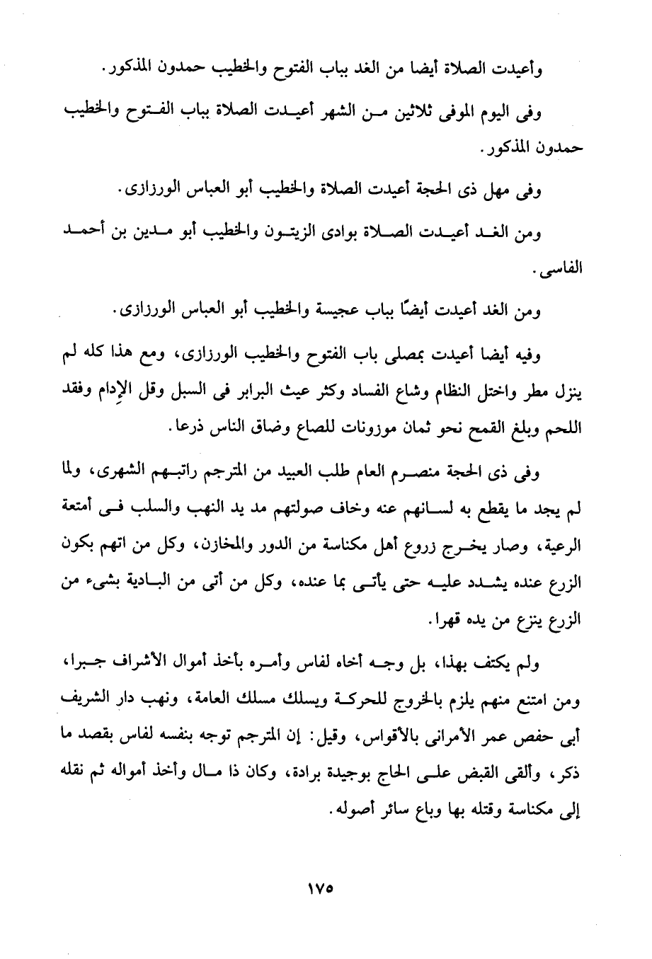 وفيه أيضًا أعيدت بمصلى باب الفتوح والخطيب الورزازى، ومع هذا كله لم ينزل مطر واختل النظام وشاع الفساد وكثر عيث البرابر في السبل وقل الإِدام وفقد اللحم وبلغ القمح نحو ثمان موزونات للصاع وضاق الناس ذرعا.