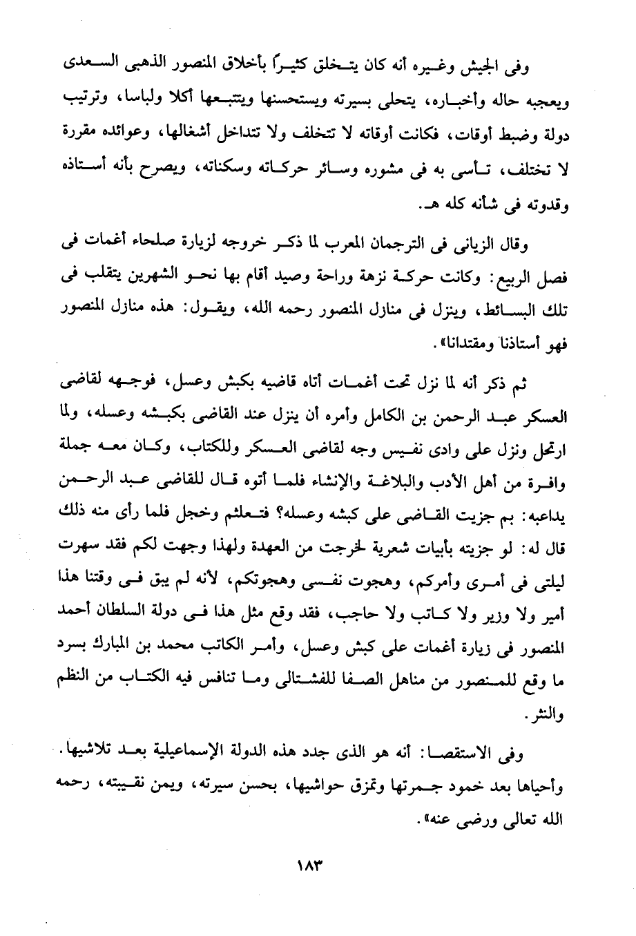 ثم ذكر أنه لما نزل تحت أغمات أتاه قاضيه بكبش وعسل، فوجهه لقاضى العسكر عبد الرحمن بن الكامل وأمره أن ينزل عند القاضي بكبشه وعسله، ولما ارتحل ونزل على وادى نفيس وجه لقاضى العسكر وللكتاب، وكان معه جملة وافرة من أهل الأدب والبلاغة والإنشاء فلما أتوه قال للقاضى عبد الرحمن يداعبه: بم جزيت القاضى على كبشه وعسله؟ فتعلثم وخجل فلما رأى منه ذلك قال له: لو جزيته بأبيات شعرية لخرجت من العهدة ولهذا وجهت لكم فقد سهرت ليلتى في أمري وأمركم، وهجوت نفسى وهجوتكم، لأنه لم يبق في وقتنا هذا أمير ولا وزير ولا كاتب ولا حاجب، فقد وقع مثل هذا في دولة السلطان أحمد المنصور في زيارة أغمات على كبش وعسل، وأمر الكاتب محمد بن المبارك بسرد ما وقع للمنصور من مناهل الصفا للفشتالى وما تنافس فيه الكتاب من النظم والنثر.