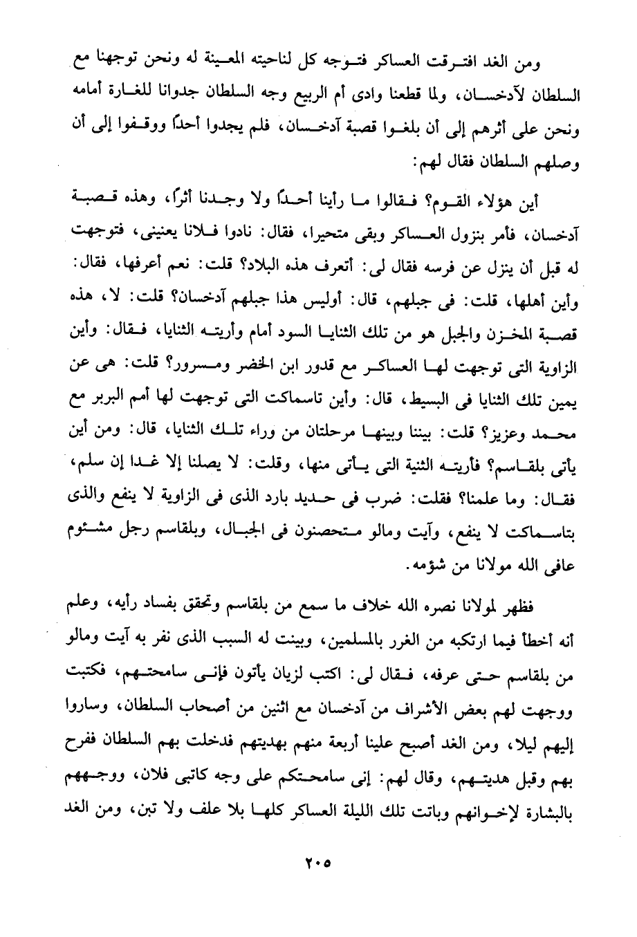 أين هؤلاء القوم؟ فقالوا ما رأينا أحدًا ولا وجدنا أثرًا، وهذه قصبة آدخسان، فأمر بنزول العساكر وبقى متحيرا، فقال: نادوا فلانا يعنينى، فتوجهت له قبل أن ينزل عن فرسه فقال لى: أتعرف هذه البلاد؟ قلت: نعم أعرفها، فقال: وأين أهلها، قلت: في جبلهم، قال: أو ليس هذا جبلهم آدخسان؟ قلت: لا، هذه قصبة المخزن والجبل هو من تلك الثنايا السود أمام وأريته الثنايا، فقال: وأين الزاوية التي توجهت لها العساكر مع قدور ابن الخضر ومسرور؟ قلت: هى عن يمين تلك الثنايا في البسيط، قال: وأين تاسماكت التي توجهت لها أمم البربر مع محمد وعزيز؟ قلت: بيننا وبينها مرحلتان من وراء تلك الثنايا، قال: ومن أين يأتي بلقاسم؟ فأريته الثنية التي يأتى منها، وقلت: لا يصلنا إلا غدا إن سلم، فقال: وما علمنا؟ فقلت: ضرب في حديد بارد الذى في الزاوية لا ينفع والذى بتاسماكت لا ينفع، وآيت ومالو متحصنون في الجبال، وبلقاسم رجل مشئوم عافى الله مولانا من شؤمه.