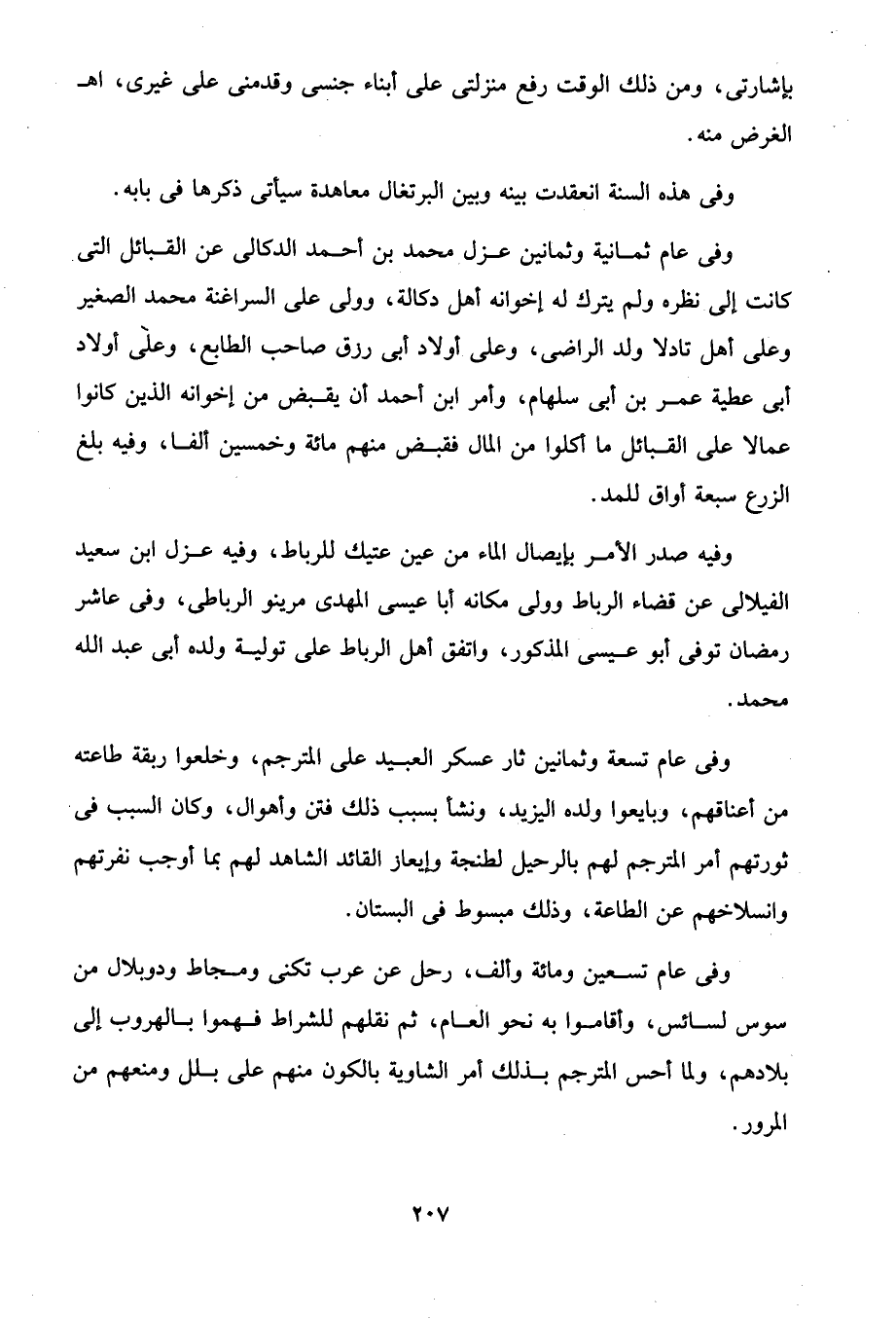 وفى عام ثمانية وثمانين عزل محمد بن أحمد الدكالى عن القبائل التي كانت إلى نظره ولم يترك له إخوانه أهل دكالة، وولى على السراغنة محمد الصغير وعلى أهل تادلا ولد الراضى، وعلى أولاد أبى رزق صاحب الطابع، وعلى أولاد أبى عطية عمر بن أبى سلهام، وأمر ابن أحمد أن يقبض من إخوانه الذين كانوا عمالا على القبائل ما أكلوا من المال فقبض منهم مائة وخمسين ألفا، وفيه بلغ الزرع سبعة أواق للمد.