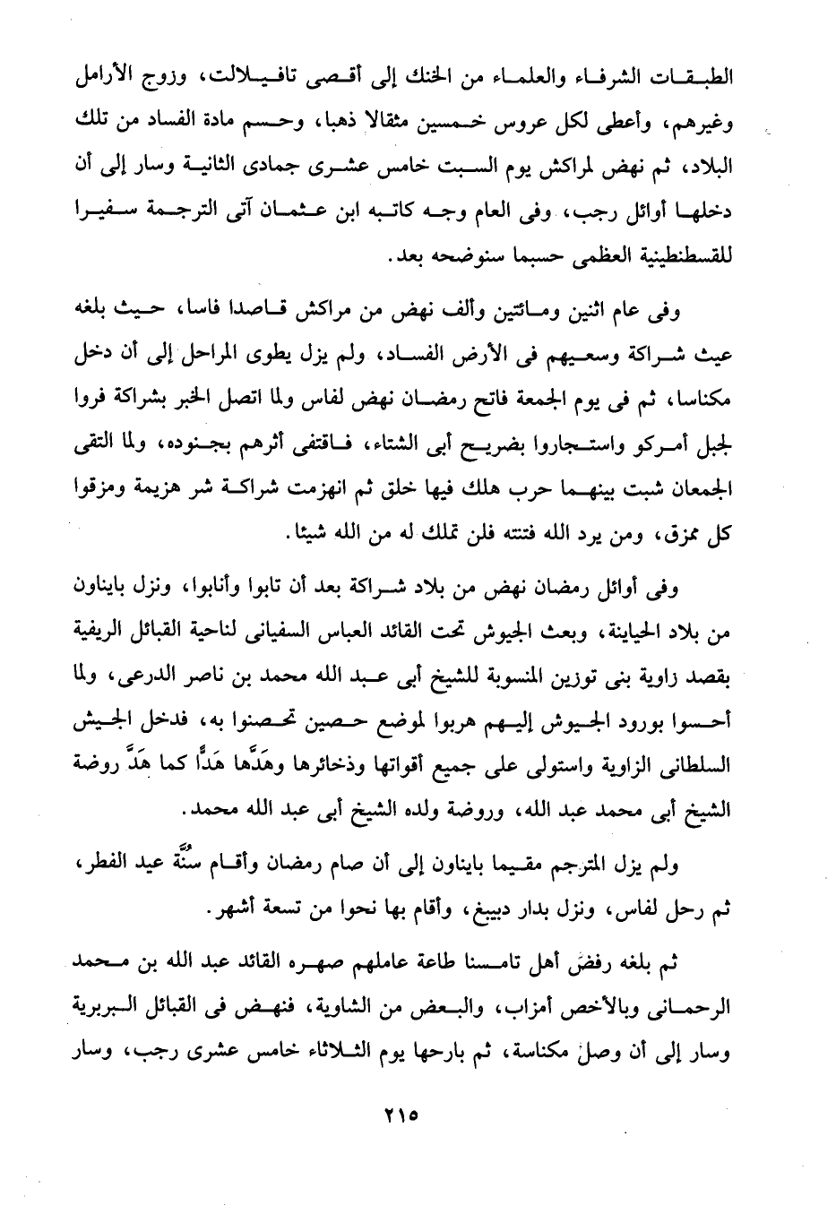 الطبقات الشرفاء والعلماء من الخنك إلى أقصى تافيلالت، وزوج الأرامل وغيرهم، وأعطى لكل عروس خمسين مثقالا ذهبا، وحسم مادة الفساد من تلك البلاد، ثم نهض لمراكش يوم السبت خامس عشرى جمادى الثانية وسار إلى أن دخلها أوائل رجب، وفى العام وجه كاتبه ابن عثمان آتى الترجمة سفيرا للقسطنطينية العظمى حسبما سنوضحه بعد.