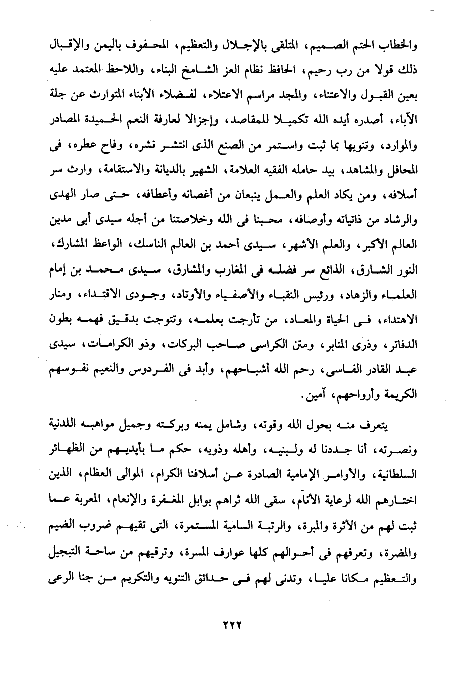 والخطاب الحتم الصميم، المتلقى بالإجلال والتعظيم، المحفوف باليمن والإقبال ذلك قولا من رب رحيم، الحافظ نظام العز الشامخ البناء، واللاحظ المعتمد عليه بعين القبول والاعتناء، والمجد مراسم الاعتلاء، لفضلاء الأبناء المتوارث عن جلة الآباء، أصدره أيده الله تكميلا للمقاصد، وإجزالا لعارفة النعم الحميدة المصادر والموارد، وتنويها بما ثبت واستمر من الصنع الذى انتشر نشره، وفاح عطره، في المحافل والمشاهد، بيد حامله الفقيه العلامة، الشهير بالديانة والاستقامة، وارث سر أسلافه، ومن يكاد العلم والعمل ينبعان من أغصانه وأعطافه، حتى صار الهدى والرشاد من ذاتياته وأوصافه، محبنا في الله وخلاصتنا من أجله سيدى أبى مدين العالم الأكبر، والعلم الأشهر، سيدى أحمد بن العالم الناسك، الواعظ المشارك، النور الشارق، الذائع سر فضله في المغارب والمشارق، سيدى محمد بن إمام العلماء والزهاد، ورئيس النقباء والأصفياء والأوتاد، وجودى الاقتداء، ومنار الاهتداء، في الحياة والمعاد، من تأرجت بعلمه، وتتوجت بدقيق فهمه بطون الدفاتر، وذرى المنابر، ومتن الكراسى صاحب البركات، وذو الكرامات، سيدى عبد القادر الفاسى، رحم الله أشباحهم، وأبد في الفردوس والنعيم نفوسهم الكريمة وأرواحهم، آمين.