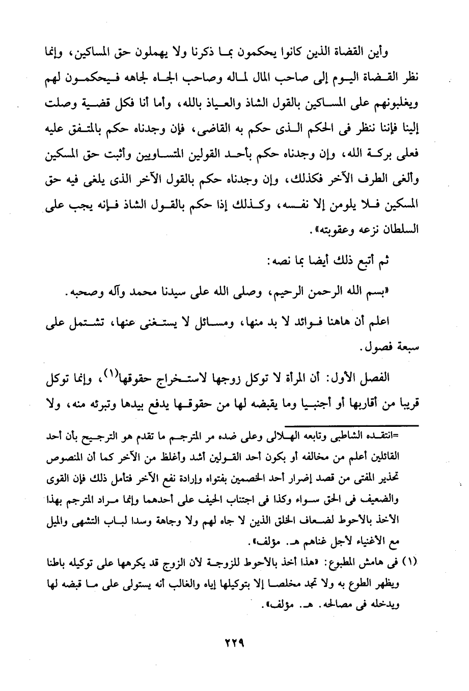 (¬1) في هامش المطبوع: "هذا أخذ بالأحوط للزوجة لأن الزوج قد يكرهها على توكيله باطنا ويظهر المطبوع به ولا تجد مخلصا إلا بتوكيلها إياه والغالب أنه يستولى على ما قبضه لها ويدخله في مصالحه. هـ. مؤلف".