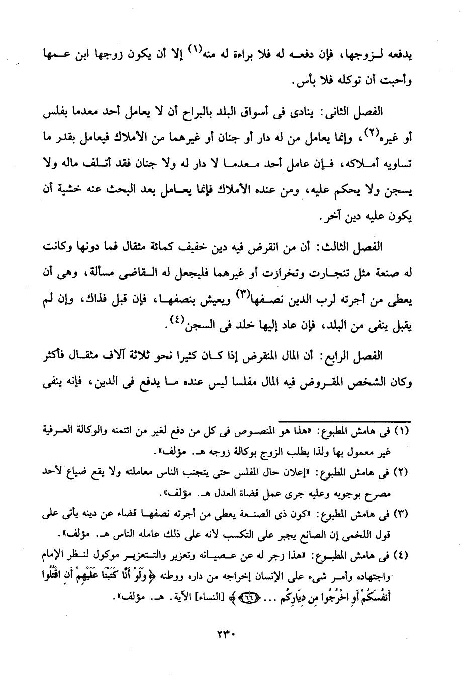 (¬2) في هامش المطبوع: "إعلان حال المفلس حتى يتجنب الناس معاملته ولا يقع ضياع لأحد مصرح بوجوبه وعليه جرى عمل قضاة العدل هـ. مؤلف".