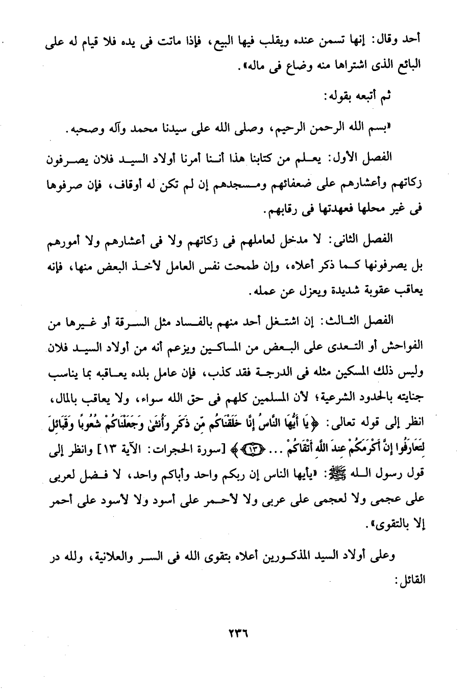 الفصل الثالث: إن اشتغل أحد منهم بالفساد مثل السرقة أو غيرها من الفواحش أو التعدى على البعض من المساكين ويزعم أنه من أولاد السيد فلان وليس ذلك المسكين مثله في الدرجة فقد كذب، فإن عامل بلده يعاقبه بما يناسب جنايته بالحدود الشرعية؛ لأن المسلمين كلهم في حق الله سواء، ولا يعاقب بالمال، انظر إلى قوله تعالى: {يَاأَيُّهَا النَّاسُ إِنَّا خَلَقْنَاكُمْ مِنْ ذَكَرٍ وَأُنْثَى وَجَعَلْنَاكُمْ شُعُوبًا وَقَبَائِلَ لِتَعَارَفُوا إِنَّ أَكْرَمَكُمْ عِنْدَ اللَّهِ أَتْقَاكُمْ ... (13)} [سورة الحجرات: الآية 13] وانظر إلى قول رسول الله - صلى الله عليه وسلم -: "يأيها الناس إن ربكم واحد وأباكم واحد، لا فضل لعربى على عجمى ولا لعجمى على عربى ولا لأحمر على أسود ولا لأسود على أحمر إلا بالتقوى".