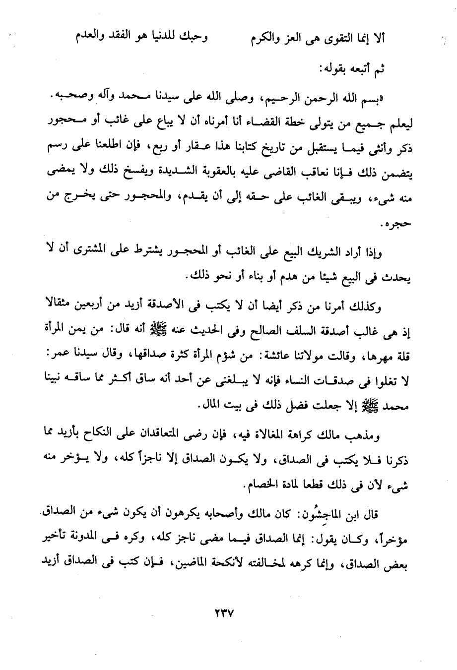 "بِسْمِ اللَّهِ الرَّحْمَنِ الرَّحِيمِ، وصلى الله على سيدنا محمد وآله وصحبه. ليعلم جميع من يتولى خطة القضاء أنا أمرناه أن لا يباع على غائب أو محجور ذكر وأنثى فيما يستقبل من تاريخ كتابنا هذا عقار أو ربع، فإن اطلعنا على رسم يتضمن ذلك فإنا نعاقب القاضى عليه بالعقوبة الشديدة ويفسخ ذلك ولا يمضى منه شئ، ويبقى الغائب على حقه إلى أن يقدم، والمحجور حتى يخرج من حجره.