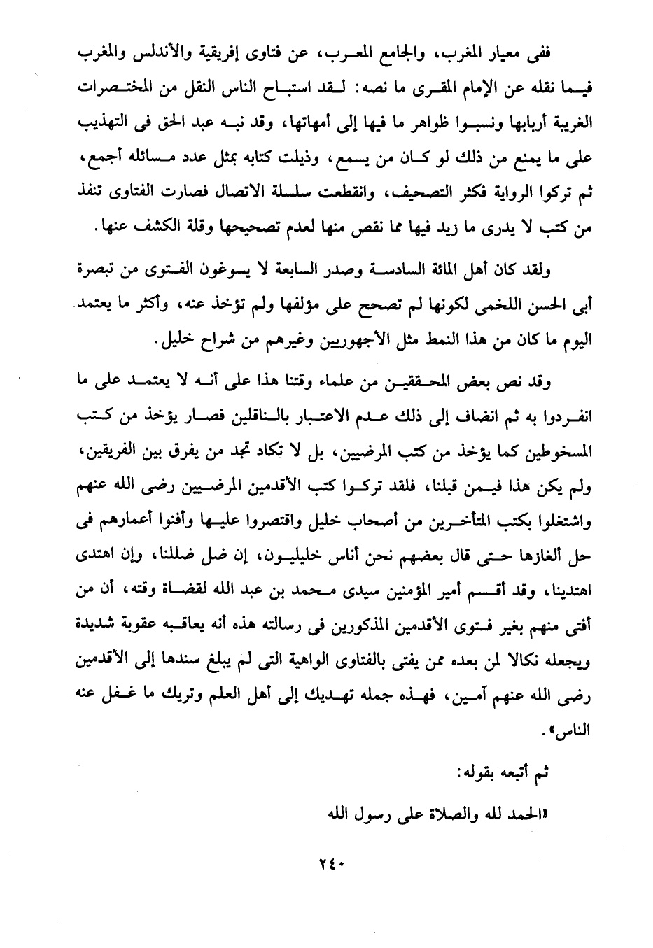 وقد نص بعض المحققين من علماء وقتنا هذا على أنه لا يعتمد على ما انفردوا به ثم انضاف إلى ذلك عدم الاعتبار بالناقلين فصار يؤخذ من كتب المسخوطين كما يؤخذ من كتب المرضيين، بل لا تكاد تجد من يفرق بين الفريقين، ولم يكن هذا فيمن قبلنا، فلقد تركوا كتب الأقدمين المرضيين رضى الله عنهم واشتغلوا بكتب المتأخرين من أصحاب خليل واقتصروا عليها وأفنوا أعمارهم في حل ألغازها حتى قال بعضهم نحن أناس خليليون، إن ضل ضللنا، وإن اهتدى اهتدينا، وقد أقسم أمير المؤمنين سيدي محمد بن عبد الله لقضاة وقته، أن من أفتى منهم بغير فتوى الأقدمين المذكورين في رسالته هذه أنه يعاقبه عقوبة شديدة ويجعله نكالا لمن بعده ممن يفتي بالفتاوى الواهية التي لم يبلغ سندها إلى الأقدمين رضى الله عنهم آمين، فهذه جمله تهديك إلى أهل العلم وتريك ما غفل عنه الناس".
