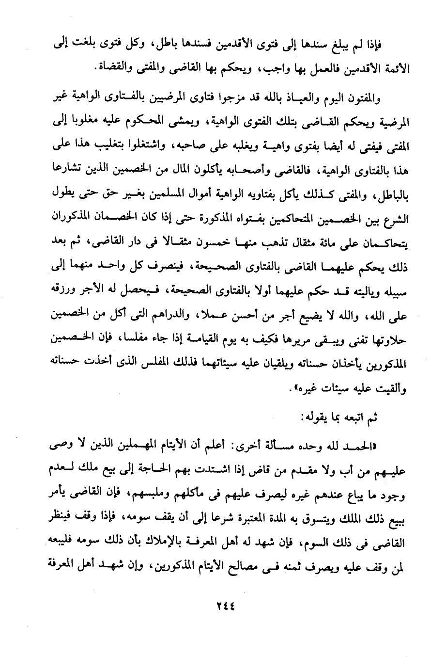 والمفتون اليوم والعياذ بالله قد مزجوا فتاوى المرضيين بالفتاوى الواهية غير المرضية ويحكم القاضي بتلك الفتوى الواهية، ويمشى المحكوم عليه مغلوبا إلى المفتى فيفتى له أيضًا بفتوى واهية ويغلبه على صاحبه، واشتغلوا بتغليب هذا على هذا بالفتاوى الواهية، فالقاضى وأصحابه يأكلون المال من الخصمين الذين تشارعا بالباطل، والمفتى كذلك يأكل بفتاويه الواهية أموال المسلمين بغير حق حتى يطول الشرع بين الخصمين المتحاكمين بفتواه المذكورة حتى إذا كان الخصمان المذكوران يتحاكمان على مائة مثقال تذهب منها خمسون مثقالا في دار القاضى، ثم بعد ذلك يحكم عليهما القاضي بالفتاوى الصحيحة، فينصرف كل واحد منهما إلى سبيله ويا ليته قد حكم عليهما أولا بالفتاوى الصحيحة، فيحصل له الأجر ورزقه على الله، والله لا يضيع أجر من أحسن عملا، والدراهم التي أكل من الخصمين حلاوتها تفنى ويبقى مريرها فكيف به يوم القيامة إذا جاء مفلسا، فإن الخصمين المذكورين يأخذان حسناته ويلقيان عليه سيئاتهما فذلك المفلس الذى أخذت حسناته وألقيت عليه سيئات غيره".