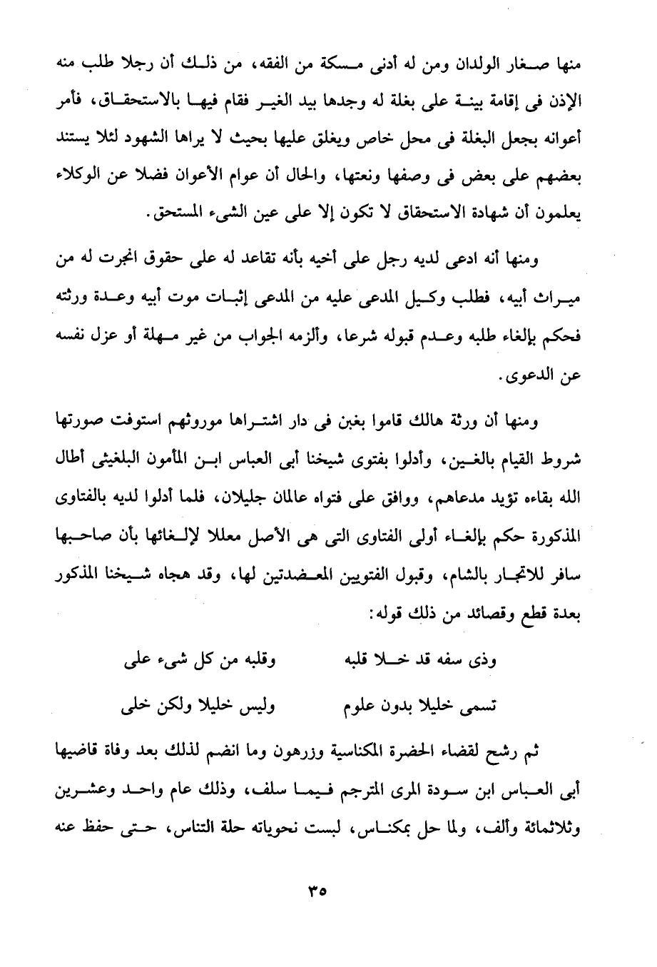 ومنها أن ورثة هالك قاموا بغبن في دار اشتراها موروثهم استوفت صورتها شروط القيام بالغين، وأدلوا بفتوى شيخنا أبي العباس ابن المأمون البلغيثى أطال الله بقاءه تؤيد مدعاهم، ووافق على فتواه عالمان جليلان، فلما أدلوا لديه بالفتاوى المذكورة حكم بإلغاء أولى الفتاوى التي هي الأصل معللا لإلغائها بأن صاحبها سافر للاتجار بالشام، وقبول الفتويين المعضدتين لها، وقد هجاه شيخنا المذكور بعدة قطع وقصائد من ذلك قوله: