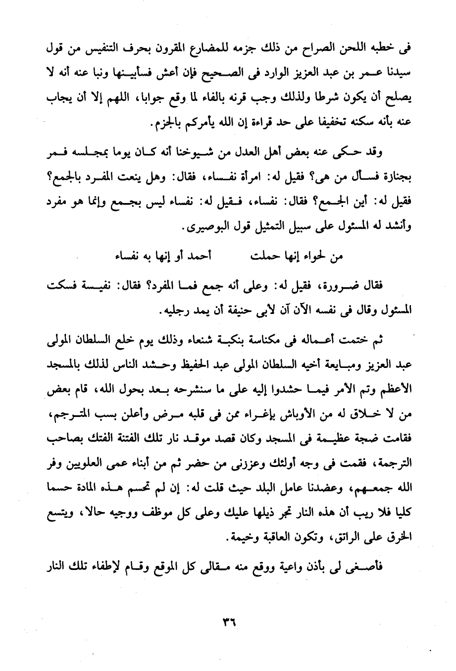 وقد حكى عنه بعض أهل العدل من شيوخنا أنَّه كان يوما بمجلسه فمر بجنارة فسأل من هي؟ فقيل له: امرأة نفساء، فقال؛ وهل ينعت المفرد بالجمع؟ فقيل له: أين الجمع؟ فقال: نفساء، فقيل له: نفساء ليس بجمع وإنما هو مفرد وأنشد له المسئول على سبيل التمثيل قول البوصيرى.