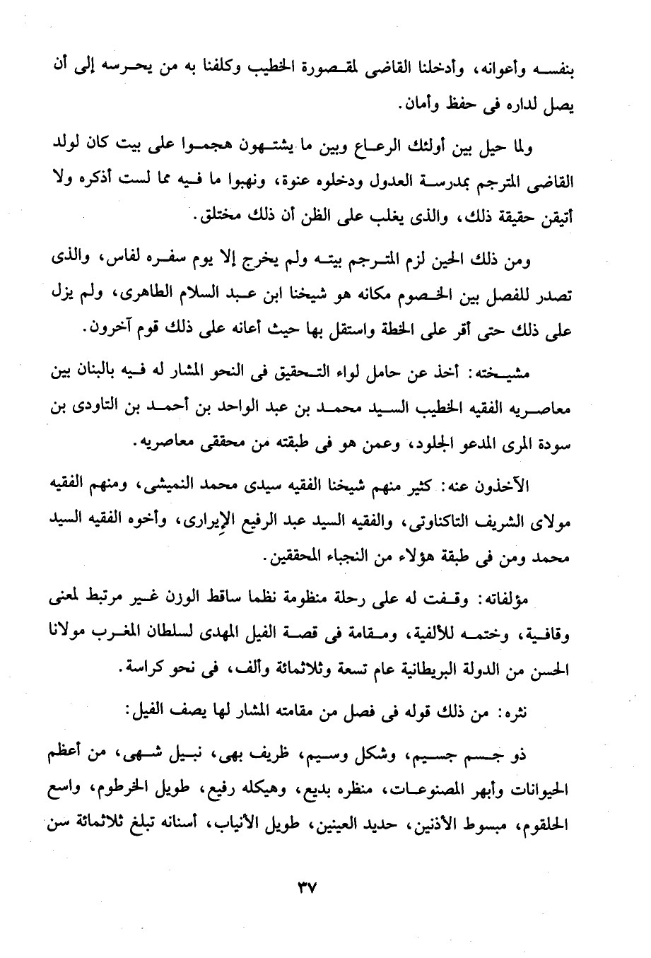مؤلفاته: وقفت له على رحلة منظومة نظما ساقط الوزن غير مرتبط لمعنى وقافية، وختمه للألفية، ومقامة في قصة الفيل المهدى لسلطان المغرب مولانا الحسن من الدولة البريطانية عام تسعة وثلاثمائة وألف، في نحو كراسة.