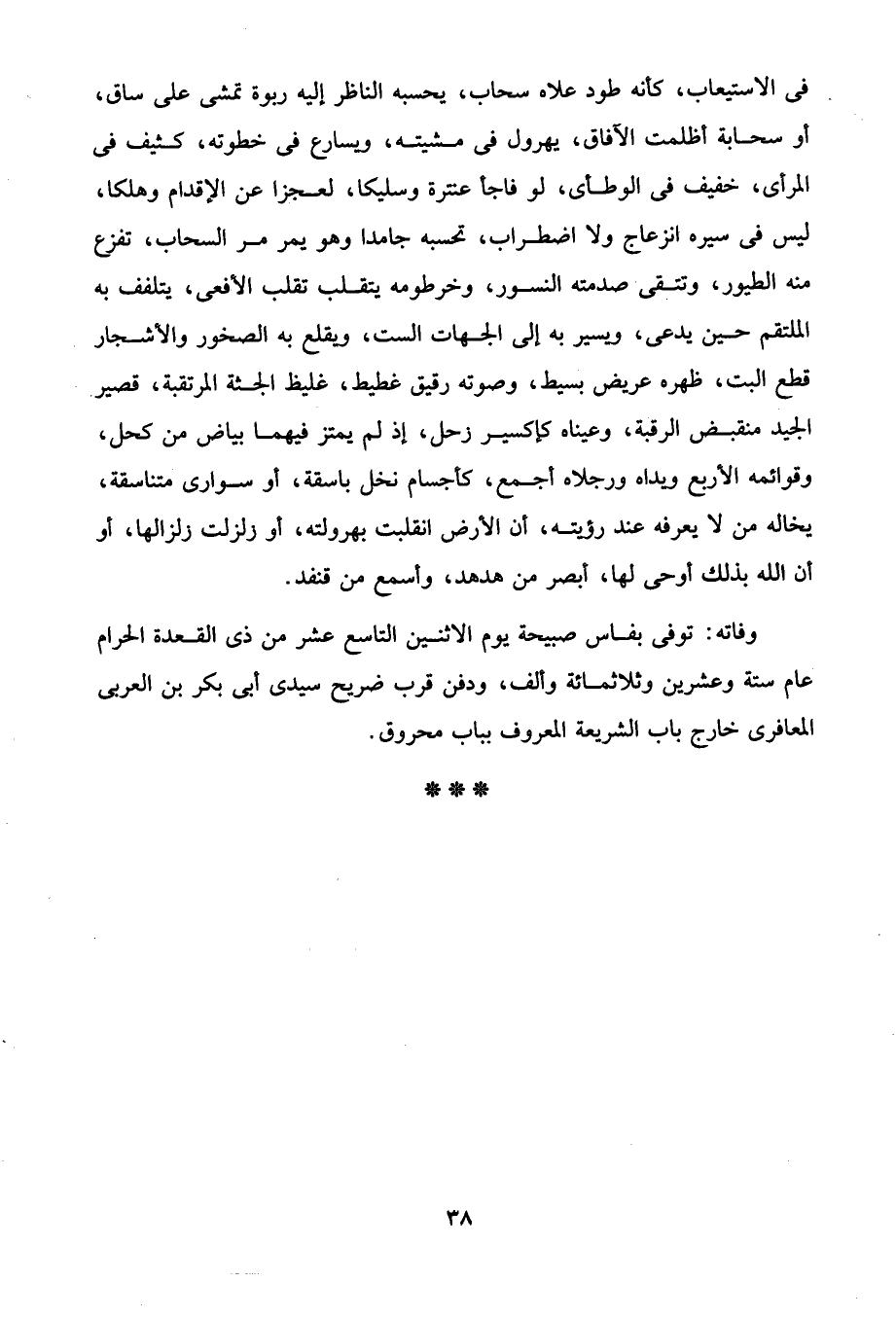 في الاستيعاب، كأنه طود علاه سحاب، يحسبه الناظر إليه ربوة تمشى على ساق، أو سحابة أظلمت الآفاق، يهرول في مشيته، وشمارع في خطوته، كثيف في المرأى، خفيف في الوطأى، لو فاجأ عنترة وسليكا، لعجزا عن الإقدام وهلكا، ليس في سيره انزعاج ولا اضطراب، تحسبه جامدا وهو يمر مر السحاب، تفزع منه الطيور، وتتقى صدمته النسور، وخرطومه يتقلب تقلب الأفعى، يتلفف به الملتقم حين يدعى، ويسير به إلى الجهات الست، ويقلع به الصخور والأشجار قطع البت، ظهره عريض بسيط، وصوته رقيق غطيط، غليظ الجثة المرتقبة، قصير الجيد منقبض الرقبة، وعيناه كإكسير زحل، إذ لم يمتز فيهما بياض من كحل، وقوائمه الأربع ويداه ورجلاه أجمع، كأجسام نخل باسقة، أو سوارى متناسقة، يخاله من لا يعرفه عند رؤيته، أن الأرض انقلبت بهرولته، أو زلزلت زلزالها، أو أن الله بذلك أوحى لها، أبصر من هدهد، وأسمع من قنفد.