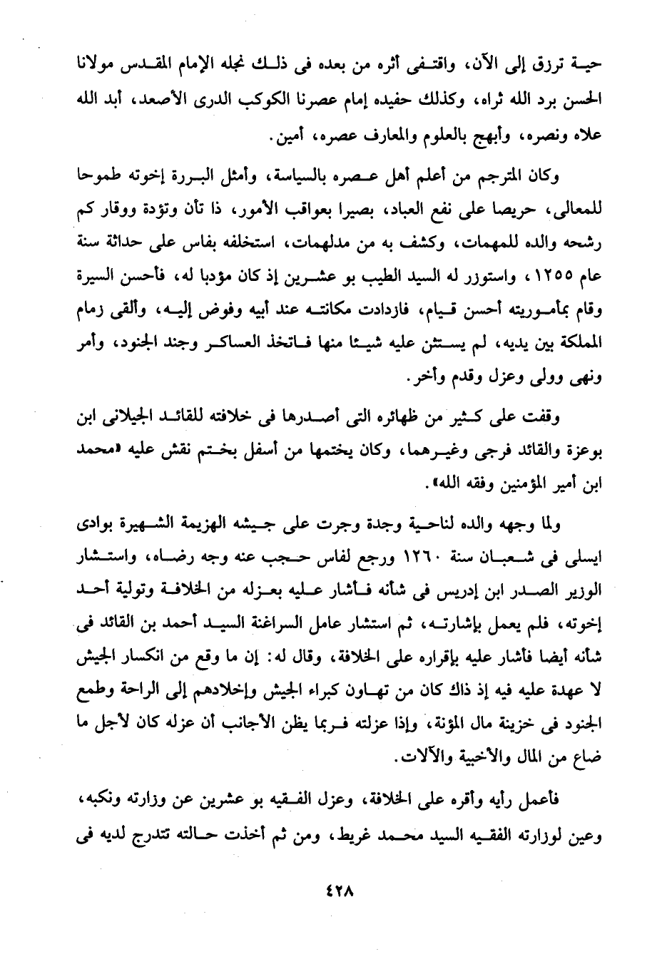 حية ترزق إلى الآن، واقتفى أثره من بعده في ذلك نجله الإمام المقدس مولانا الحسن برد الله ثراه، وكذلك حفيده إمام عصرنا الكوكب الدرى الأصعد، أبد الله علاه ونصره، وأبهج بالعلوم والمعارف عصره، أمين.
