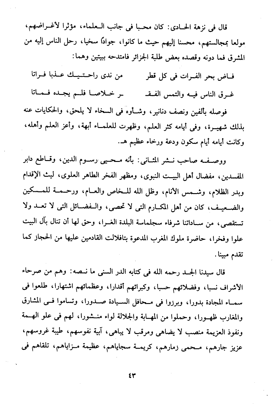 قال سيدنا الجد رحمه الله في كتابه الدر السنى ما نصه: وهم من صرحاء الأشراف نسبا، وفضلائهم حسبا، وكبرائهم أقدارا، وعظمائهم اشتهارا، طلعوا في سماء المجادة بدورا، وبرزوا في محافل السيادة صدورا، وتساموا في المشارف والمغارب ظهورا، وحملوا من المهابة والجلالة لواء منشورا، لهم في علو الهمة ونفوذ العزيمة منصب لا يضاهى ومرقب لا يباهى، آبية نفوسهم، طيبة غروسهم، عزيز جارهم، محمى زمارهم، كريمة سجاياهم، عظيمة مزاياهم، تلقاهم في