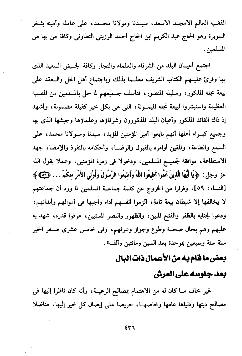 اجتمع أعيان البلد من الشرفاء والعلماء والتجار وكافة الجيش السعيد الذى بها وقرئ عليهم الكتاب الشريف معلما بذلك وباجتماع أهل الحل والعقد على بيعة نجله المذكور، وسليله المنصور، فتأسف جميعهم لما حل بالمسلمين من المصيبة العظيمة واستبشروا لبيعة نجله الميمونة، التي هى بكل خير كفيلة مضمونة، وأشهد إذ ذاك القائد المذكور وأعيان البلد المذكورون وشرفاؤها وعلماؤها وجيشها الذى بها وجميع كبراء أهلها أنهم بايعوا أمير المؤمنين المؤيد، سيدنا ومولانا محمد، على السمع والطاعة، وتلقين أوامره بالقبول والرضا، وأحكامه بالنفوذ والإمضا، جهد الاستطاعة، موافقة لجميع المسلمين، ودخولا في زمرة المؤمنين، وعملا يقول الله عز وجل: {يَاأَيُّهَا الَّذِينَ آمَنُوا أَطِيعُوا اللَّهَ وَأَطِيعُوا الرَّسُولَ وَأُولِي الْأَمْرِ مِنْكُمْ ...} [النساء: 59]، وفرارا من الخروج عن كلمة جماعة المسلمين لما ورد أن جماعتهم لا يخالفها إلا شيطان بيعة تامة، ألزموا أنفسهم أداء واجبها في أموالهم وأبدانهم، ودعوا لجنابه بالظفر والفتح المبين، والظهور والنصر المستبين، عرفوا قدره، شهد به عليهم وهم بحال صحة وطوع وجوار وعرفهم، وفى خامس عشرى صفر الخير سنة ستة وسبعين بموحدة بعد السين ومائتين وألف".