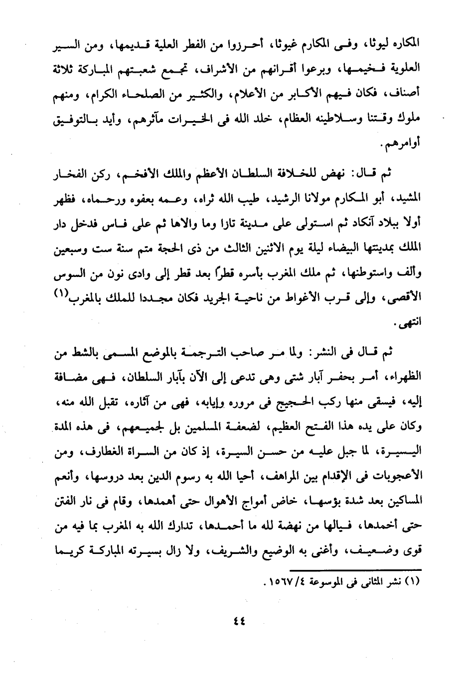 ثم قال: نهض للخلافة السلطان الأعظم والملك الأفخم، ركن الفخار المشيد، أبو المكارم مولانا الرشيد، طيب الله ثراه، وعمه بعفوه ورحماه، فظهر أولا ببلاد آنكاد ثم استولى على مدينة تازا وما والاها ثم على فاس فدخل دار الملك بمدينتها البيضاء ليلة يوم الاثنين الثالث من ذى الحجة متم سنة ست وسبعين وألف واستوطنها، ثم ملك المغرب باسره قطرًا بعد قطر إلى وادى نون من السوس الأقصى، وإلى قرب الأغواط من ناحية الجريد فكان مجددا للملك بالمغرب (¬1) انتهى.