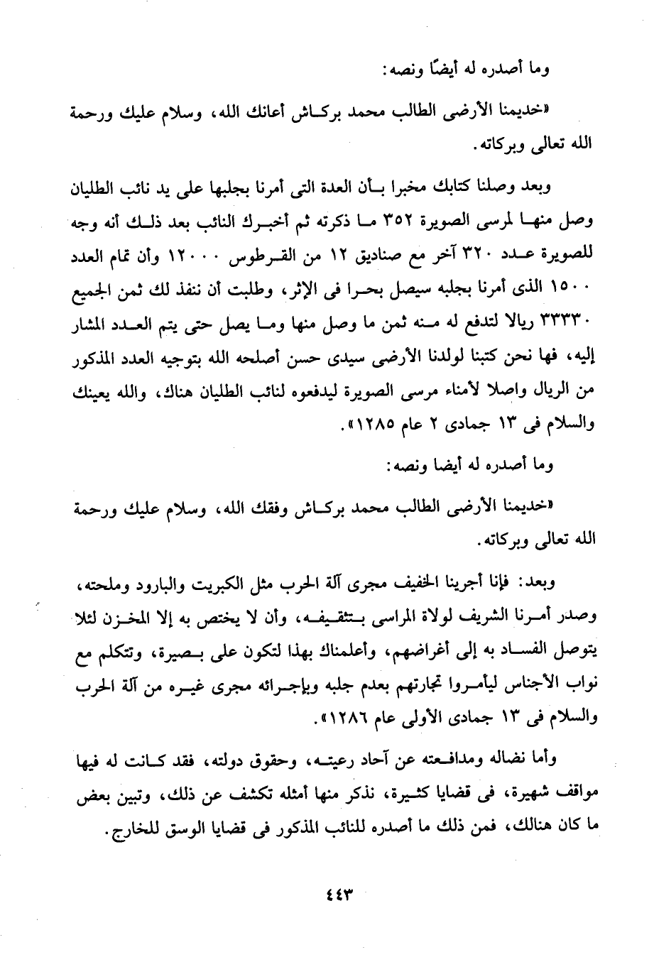 وبعد: فإنا أجرينا الخفيف مجرى آلة الحرب مثل الكبريت والبارود وملحته، وصدر أمرنا الشريف لولاة المراسى بتثقيفه، وأن لا يختص به إلا المخزن لئلا يتوصل الفساد به إلى أغراضهم، وأعلمناك بهذا لتكون على بصيرة، وتتكلم مع نواب الأجناس ليأمروا تجارتهم بعدم جلبه وبإجرائه مجرى غيره من آلة الحرب والسلام في 13 جمادى الأولى عام 1286".
