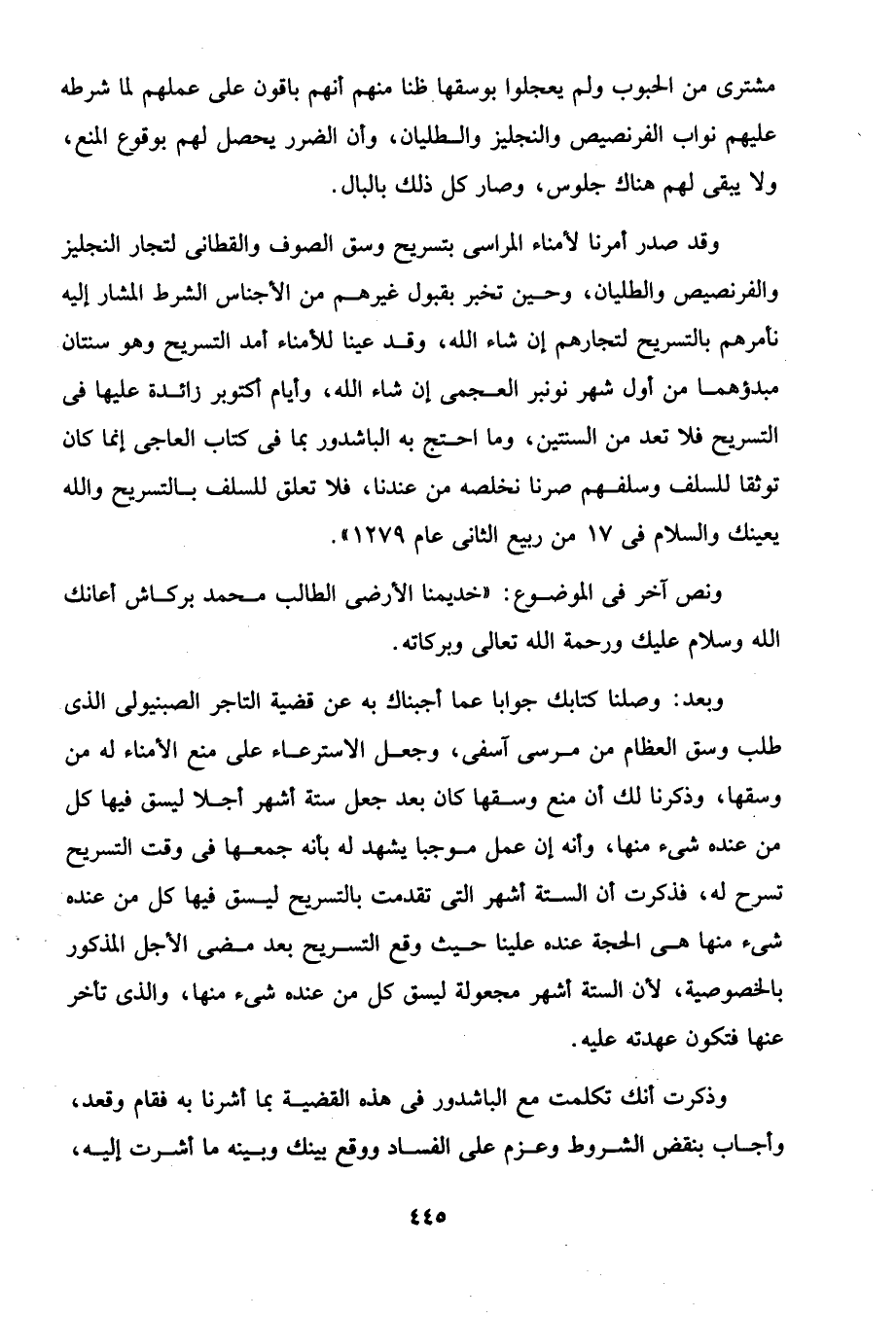 وقد صدر أمرنا لأمناء المراسى بتسريح وسق الصوف والقطانى لتجار النجليز والفرنصيص والطليان، وحين تخبر بقبول غيرهم من الأجناس الشرط المشار إليه نأمرهم بالتسريح لتجارهم إن شاء الله، وقد عينا للأمناء أمد التسريح وهو سنتان مبدؤهما من أول شهر نونبر العجمى إن شاء الله، وأيام أكتوبر زائدة عليها في التسريح فلا تعد من السنتين، وما احتج به الباشدور بما في كتاب العاجى إنما كان توثقا للسلف وسلفهم صرنا نخلصه من عندنا، فلا تعلق للسلف بالتسريح والله يعينك والسلام في 17 من ربيع الثانى عام 1279".